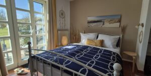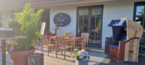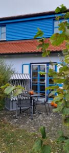 Ein Strandkorb auf der Terrasse lädt zum entspannen ein. Das kleine chice Badezimmer ist mit Dusche, Fön und Kosmetikspiegel ausgestattet.